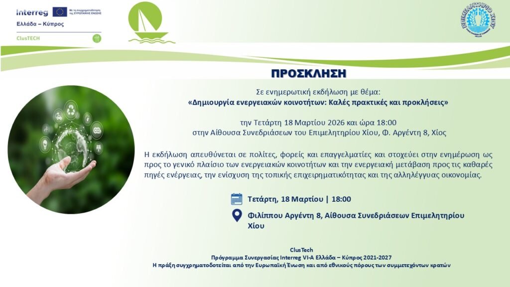 Το Επιμελητήριο Χίου διοργανώνει ανοικτή ενημερωτική εκδήλωση με θέμα «Δημιουργία Ενεργειακών Κοινοτήτων: Καλές Πρακτικές και Προκλήσεις», στο πλαίσιο της πράξης ClusTech που υλοποιείται στο πλαίσιο του Προγράμματος Συνεργασίας Interreg VI-A Ελλάδα-Κύπρος 2021-2027.
